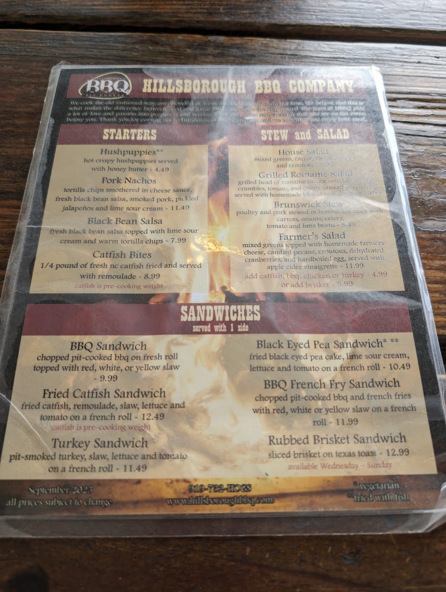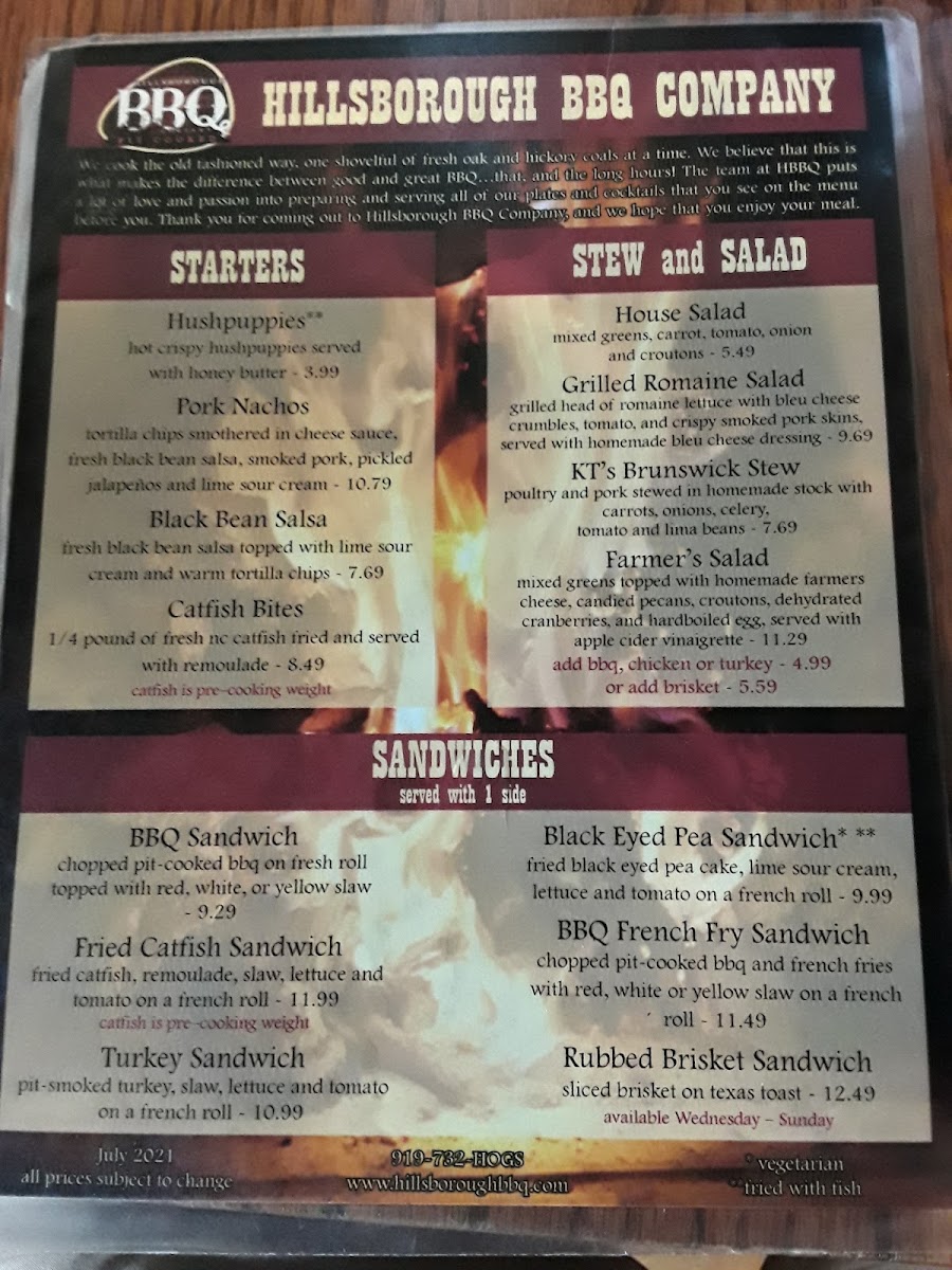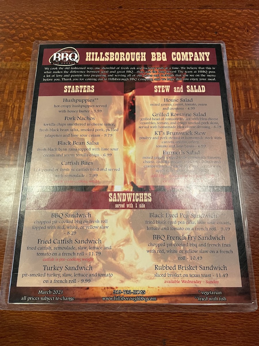 When you step into Hillsborough BBQ Company Menu, you’re in for a treat that perfectly captures the essence of Southern comfort food. Located at 236 S Nash St, Hillsborough, NC, this spot is all about good, hearty meals made with love. The menu is a dream for anyone craving that classic BBQ experience, with slow-cooked meats that are rich in flavor and always tender. From smoky ribs to pulled pork sandwiches, there’s something to satisfy every appetite. Whether you're stopping by for lunch or dinner, the sides are just as delicious, with crispy fries, cornbread, and slaw to round out your meal. Each dish is prepared with care, using recipes passed down through the years, ensuring you get that authentic taste with every bite. Whether you're a BBQ enthusiast or just looking for a delicious, laid-back meal, this menu has you covered.