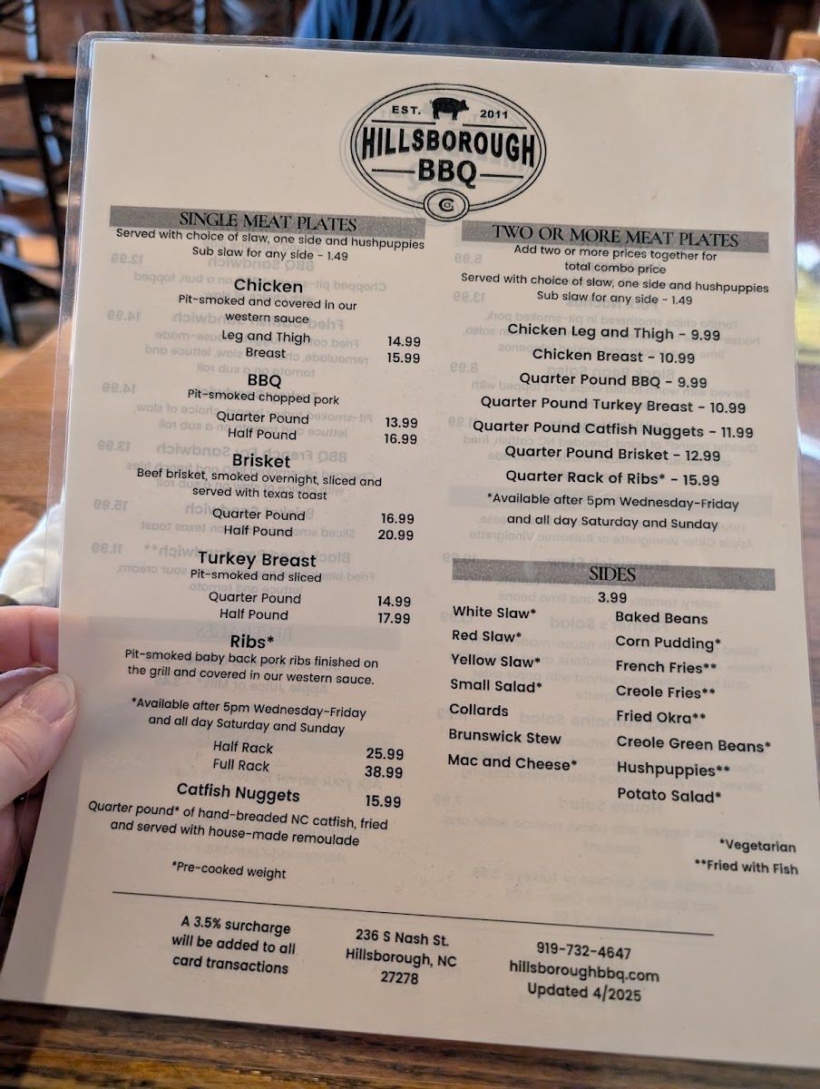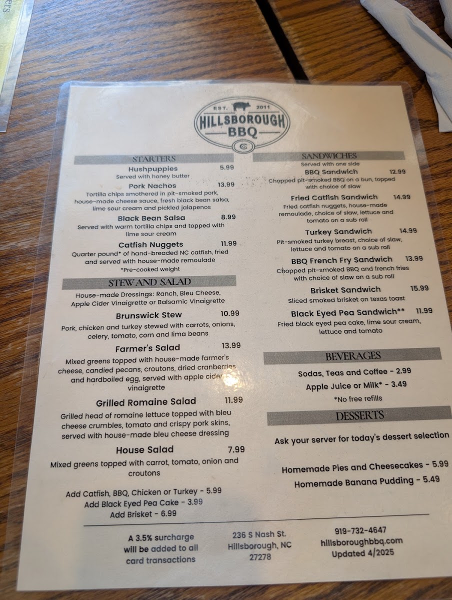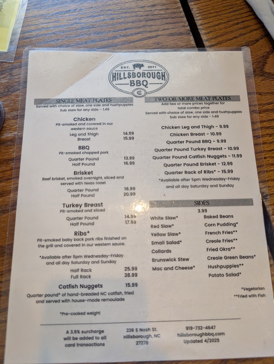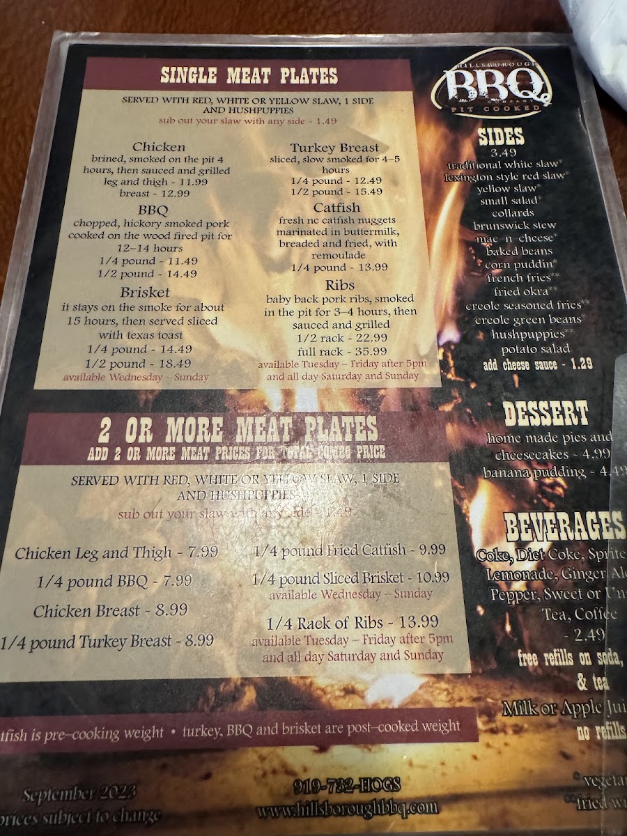 When you step into Hillsborough BBQ Company Menu, you’re in for a treat that perfectly captures the essence of Southern comfort food. Located at 236 S Nash St, Hillsborough, NC, this spot is all about good, hearty meals made with love. The menu is a dream for anyone craving that classic BBQ experience, with slow-cooked meats that are rich in flavor and always tender. From smoky ribs to pulled pork sandwiches, there’s something to satisfy every appetite. Whether you're stopping by for lunch or dinner, the sides are just as delicious, with crispy fries, cornbread, and slaw to round out your meal. Each dish is prepared with care, using recipes passed down through the years, ensuring you get that authentic taste with every bite. Whether you're a BBQ enthusiast or just looking for a delicious, laid-back meal, this menu has you covered.