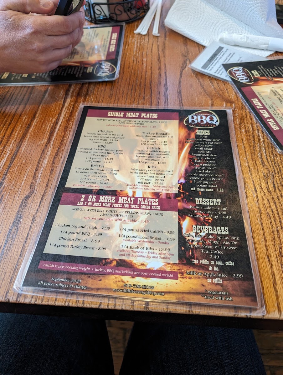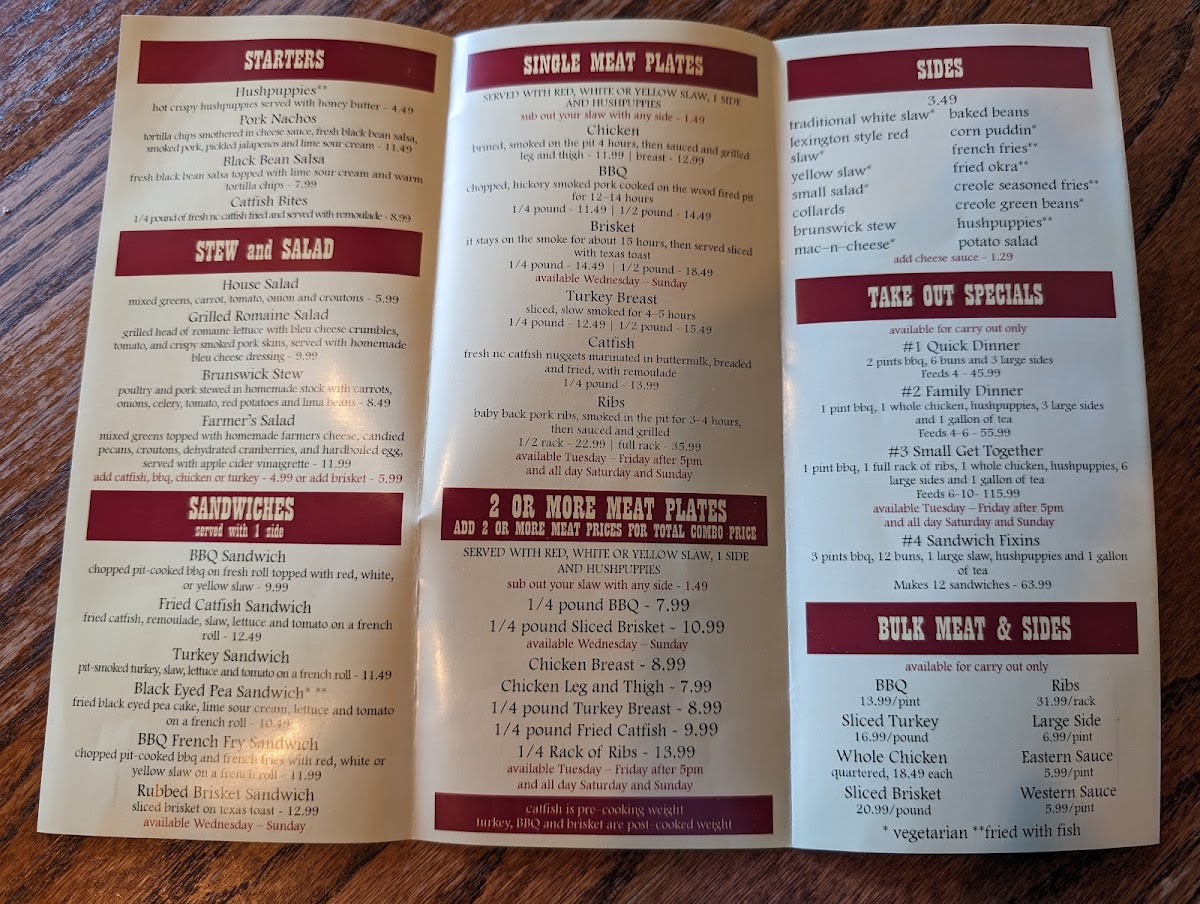 1 pint of BBQ, 1 whole chicken, 1 pint of hushpuppies, 3 pint sides & a gallon of tea